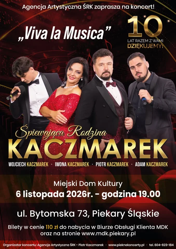 W Piekarach Śląskich zapowiada się wieczór z muzyką, która potrafi rozgrzać serce już od pierwszych dźwięków Śpiewająca Rodzina Kaczmarek przyjeżdża z nową trasą koncertową „10 lat z Wami”, więc będzie to spotkanie pełne klasyki, emocji i rodzinnej energii. To dobry moment, żeby zarezerwować sobie ten wieczór i dać się porwać muzyce na żywo.